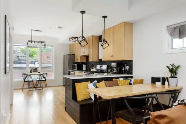 Midtown Modern is a luxury meets industrial condo with a little Detroit flare. Entering the condo, there is a flight of stairs that will bring you to the open main floor which includes a newly renovated kitchen, dining area, living room, and half bath. The kitchen of Midtown Modern is designed and stocked by avid travelers who love the flexibility to partake in the local cuisine or cook a full meal at home utilizing local ingredients. It is fully stocked with pots and pans, utensils, spices, oils, and anything else you need to make a gourmet meal. While you cook in the kitchen, your guests can relax in the open floor plan dining or living areas, play games, or watch the 50-inch TV. On the main floor, you will also find a very comfortable pull-out couch that sleeps 2 and a patio with an outdoor grill.