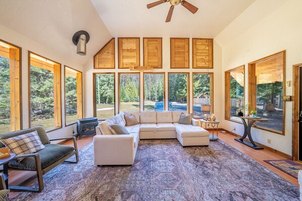 Inside the cabin, you'll find rustic charm combined with modern comfort. There are two cozy bedrooms, one with a queen bed and the other a full and a twin bed, one full bathroom (clawfoot tub/shower combo), a bonus room for designated work space to relax, and a queen sized sofa bed in the famiy room. The heart of the home is a spacious family room with floor-to-ceiling windows that frame breathtaking forest views and let in tons of natural light.