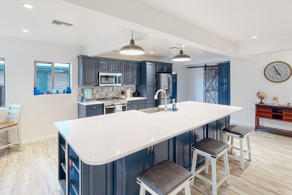 After the day's adventures, relax on the plush living room sectional while streaming shows and movies on the smart TV, or mix up some drinks at the bar for some happy hour entertainment in the Arizona room. Gleaming counters and all-new, stainless steel appliances shine in the full kitchen, equipped with everything you need to make family mealtimes complete. Central air-conditioning, free WiFi, and a private washer/dryer round out the home essentials.