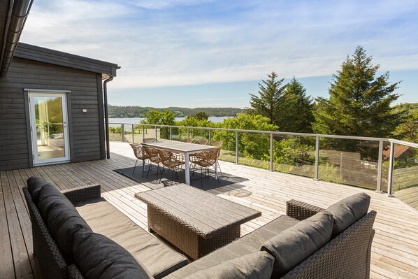 This very special holiday home enjoys panoramic views of the water from the wrap around deck, outdoor space includes two relaxing seating areas, dining table with seating for up to 10 and weber gas grill.
