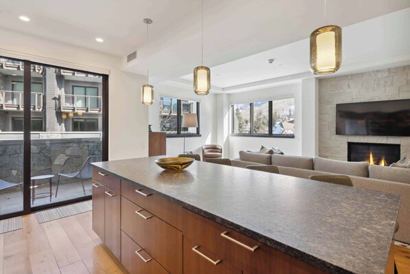 In the heart of Vail, this contemporary single-level residence offers a great room with a gas fireplace and smart TV, perfect for cozying up after a long day on the slopes. Enjoy mountain views from the private terrace or take advantage of The Lion's amenities like an infinite lap pool and fitness facility.