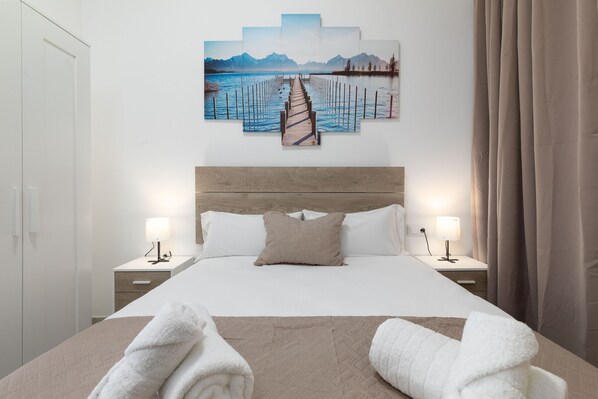 - Main bedroom with a double matrimonial bed of 150x190 cm equipped with a standing fan.