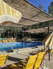 Escape to Huttopia Paradise Springs, where a tranquil atmosphere awaits. Unwind on the sunny terrace, sip coffee in the lobby or enjoy a meal at the restaurant - with an outdoor pool and entertainment area nearby, you'll never run out of things to do.