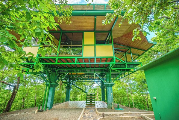 The 2500 square foot home is constructed with forest green steel, teak wood, yellow paint and has a 100% open-air spacious living area, all architected to blend with its natural surroundings. Trees outside the home attract monkeys, tropical birds, iguanas and frogs.