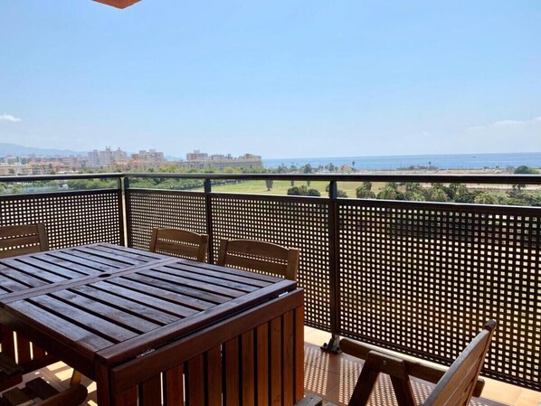 This three-bedroom accommodation features a master bedroom with a double bed and two bedrooms with two single beds each. The separate kitchen is fully equipped, providing everything you need for a worry-free vacation. The living-dining room, with a double sofa bed, connects to a terrace offering exceptional views of the sea and the Vega of Torre del Mar.