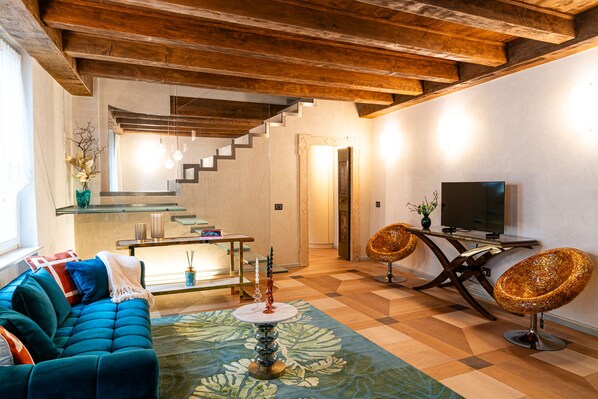 MARIA CALLAS Luxury Flat is an exclusive angle inserted in a 1300 palace which has been carefully restored maintaining its historicity; cozy and elegant, cared for in every detail, a refined environment with large spaces, the careful restoration has maintained the frescoes and the original exposed beams of the time, a dip into the past, in harmony with the modern and comfortable furnishings, where you can spend an unforgettable stay in the wonderful city of Verona.