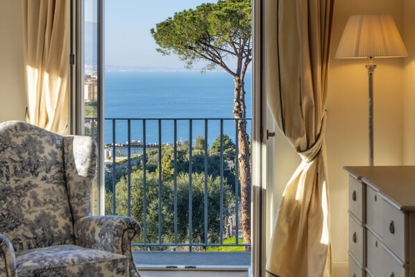 Situated on the upper level, this Deluxe Sea View room opens directly toward the horizon. Its private balcony frames the sparkling Gulf of Naples, making it the ideal retreat for sunrise coffee or an evening aperitivo in total tranquility.