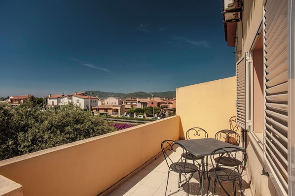 In the south of Sardinia, the charming "Villa Erica" welcomes you with the cozy apartment "Cindy" in the small village of Villa San Pietro. The 75m² apartment consists of a living room with sofa bed, a well-equipped kitchen, 2 bedrooms as well as a bathroom and can accommodate 6 people. Additional amenities include Wi-Fi, air conditioning, a TV and a washing machine, while a baby crib can be provided on request. A furnished balcony where you can have a relaxing breakfast while enjoying the view is also part of the apartment. In the shared outdoor area, a large terrace and a well-kept garden with olive trees await you. From the house owner you can get valuable tips and homemade products, such as honey, jam, fruits or oil. Due to the good location between the sea and the mountains, the apartment is not only the ideal starting point for a beach vacation, but also for hiking or biking tours. The nearest beaches are only 7 minutes (4km) away by car. For those interested in culture and history, a visit to the archaeological site of Nora is recommended, which is an 11-minute drive (6.3km) away. There are also a handful of restaurants, a bar (500m) and a supermarket (850m) within a 4-10 minute walk from the apartment. The capital, Cagliari, with its airport and port, is a 33-minute drive (36km) away.
