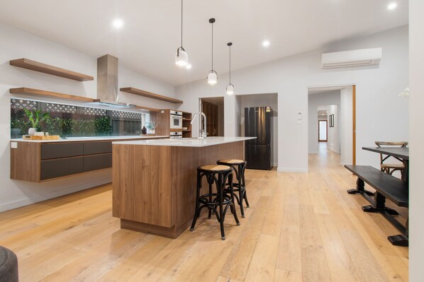Enjoy the spacious interior with high ceilings, abundant natural light, and modern amenities including split system air conditioning/heating in every room and a cozy log gas fire in the main living room. The well-equipped kitchen features top-of-the-line appliances including a Smeg induction stove and oven.