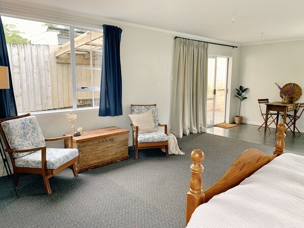 Escape to this serene 45sqm self-contained studio, complete with antique furniture and a cozy kitchenette. Unwind in the small private outdoor area or take a short drive to Waihi Beach, Whiritoa, or explore local walks and eateries.