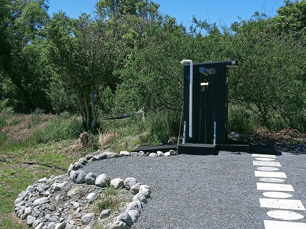 The shower, composting toilet and an outdoor kitchen complete the space.