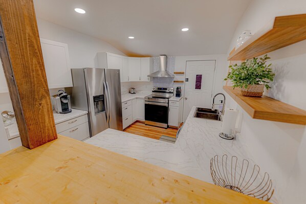 Kitchen: The fully equipped kitchen invites you to whip up hearty meals. Brew a cup of locally roasted coffee and savor it at the breakfast bar!