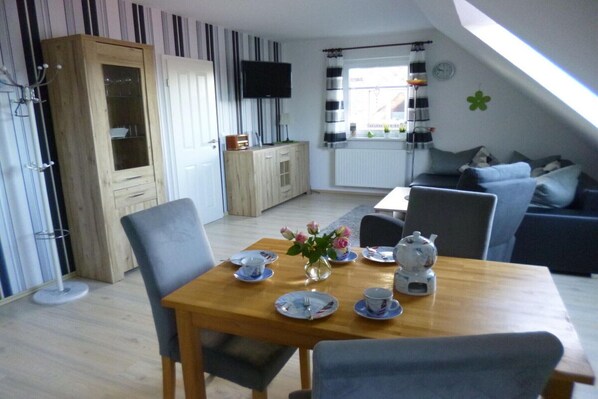 In the heart of East Frisia, The Gerdes holiday apartment offers a cozy retreat with a seating area, TV and dining table. This sustainable house built in 2012 is perfect for relaxation with its well-equipped kitchen and shower room.