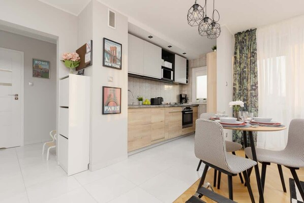 This fully equipped apartment can comfortably accommodate up to 4 people - an ideal choice for a family getaway or a group of friends. The highly functional 41.5 m² space consists of a living room with a kitchenette, a separate bedroom and a bathroom with a bathtub and toilet. There is also a small balcony with garden furniture, where you can enjoy a sip of aromatic morning coffee. The living area, equipped with a comfortable sofa bed and a TV with access to cable channels and a Smart TV function, is the perfect place to relax. The elegant bedroom offers a king-size bed and a desk with a chair, so guests working remotely will be able to take care of business duties in comfort. The apartment also features high-speed, free Wifi connection. A wide range of amenities and comprehensive furnishing of the apartment with necessary kitchen and bathroom accessories and equipment guarantees a comfortable stay. A complimentary set of toiletries (soap, shampoo and shower gel), towels and linens are provided to facilitate the start of each visit. The apartment also provides guests with a washing machine, which is sure to be appreciated by families with small children or those planning a longer stay. The interior has a modern design, which is warmed by wooden elements and parquet floors. Harmonious, beautiful design and attention to detail will satisfy even the most demanding guests.