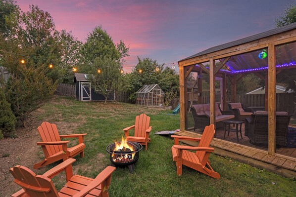 • Relax or entertain in the fenced backyard and sunroom: • Comfortable seating and a disco ball feature • Outdoor movie projector for cozy nights under the stars • Weber grill • Firepit with 4 chairs • EV (Tesla) charger for eco-friendly convenience • FREE parking
