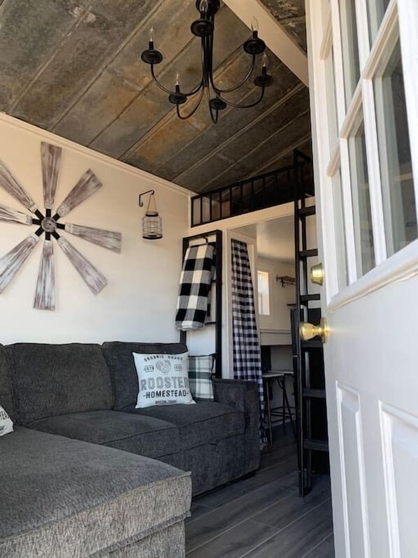 The cutest tiny house! It sits at the top of a hill with beautiful views. You can see forever! It has all the amenities you need. Plus lots of fun stuff to do around the area. It is only 160sf so it fits 2 adults comfortably. You can sleep a couple of younger kids on the couch bed. It has a coffee maker, a toaster/air fryer oven, electric skillet, microwave and fridge. Plus a neat fireplace, a TV, WIFI, a queen bed loft and a comfy sofa bed.