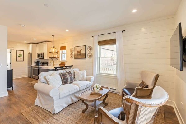 Welcome to Kildahl House where 4 separate one-bedroom farmhouse apartments await! Book just 1 or all 4. Each charming suite is light, airy and tastefully decorated to provide a luxury experience. Each unit features a comfortable seating area, a large bathroom with a Carrera marble shower surround, a separate bedroom with a king-size bed and a fully equipped galley style kitchen with brand new Samsung appliances. Kick back and relax in this calm, stylish space. Suite #2 is on the first floor.