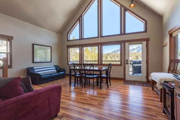 This chalet has 2 bedrooms, each with a queen bed, one bathroom, a full kitchen and open dining area plus a loft. Washer and dryer are located downstairs.