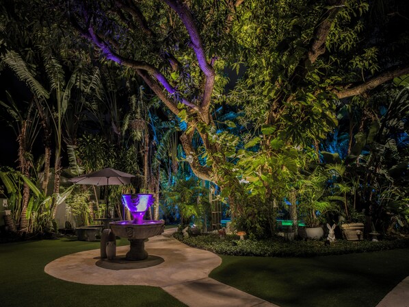 Escape to a tropical paradise in this luxurious estate, where lush gardens and fountains surround three separate quarters. Relax in the heated swimming pool or unwind in the jacuzzi, then enjoy al fresco dining at one of two outdoor tables.