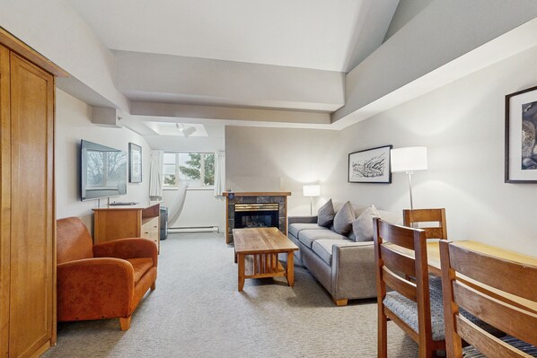 TV, fireplace - Stylish mountain condo with gym, fireplace & easy walking access to lifts (Whistler)