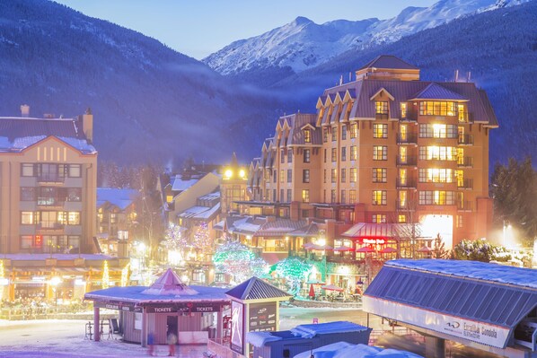 Guests warm up by the lobby fireplace or head straight to the slopes outside. The walkable streets of Whistler reveal charming shops worth exploring.