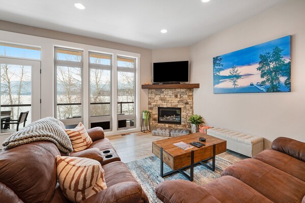 The outdoor spaces here are a joy, beginning with the condo's covered deck overlooking Whitefish Lake. It's the perfect spot to linger with morning coffee, barbecue your lunch on the gas grill, or cuddle up around the fire table as the alpenglow colors the mountains.