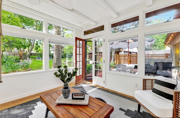 Sleepy Hollow Chateau features two large living room spaces--the formal living room features soaring vaulted ceilings and elegant hardwood floors that is well appointed with plush upholstered furniture while the back patio living room gives out all the fun vibes with bright mid-mod decor, neon bar sign, and large 65' flatscreen TV to catch up on the big games or the latest in streaming entertainment. Slide the massive patio doors open to the patio that features a large farmhouse style entertainment table and chairs along with new Gas grill. Swivel the Patio Room TV out towards the outdoors for even more entertainment options! Don't miss the bowling ball edged french gardens on your way out to another small patio conversation area and finally a fire pit the entire family can gather round.