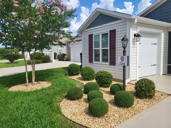 You'll feel welcomed and relaxed as soon you open the front door to your home away from home. With the soft, warm colors of this tastefully decorated home you'll feel right at home immediately. The large kitchen with ample cabinets is fully equipped with everything you need to prepare meals and serve meals. The living room offers plenty of comfortable seating to enjoy your favorite television shows on the 65" 4K flat screen TV. The master bedroom has a comfortable king size bed, 55" 4K flat screen TV, large walk-in closet, and a private master bath with a walk-in shower and his and hers vanity sinks. The guest bedroom has a comfortable queen size bed for your guests to relax & enjoy. The bedrooms and both bathrooms are set up with extra towels and linens. The side patio provides for a great spot to bbq & relax after a fun day before heading out to the squares to dance the nights away. The screen enclosed front porch offers comfortable seating perfect for enjoying the morning coffee or juice and newspaper or planning your day here in The Villages. This home has many upgrades that are to many to mention!!!!!