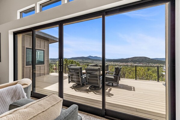 Designed for discerning adult travelers, this 4-bedroom king retreat near the Grand Canyon offers amazing views of Bill Williams Mountain from it's perch high on a hillside. The night sky from the balcony is stunning year-round. Picturesque sunsets enhance the natural beauty. With 4 king bedrooms and a welcoming great room, it’s perfect for friends or family gatherings. The linear fireplace provides warmth on chilly nights. This home is fully equipped for you to arrive and enjoy time together. This home has nothing to occupy small children.