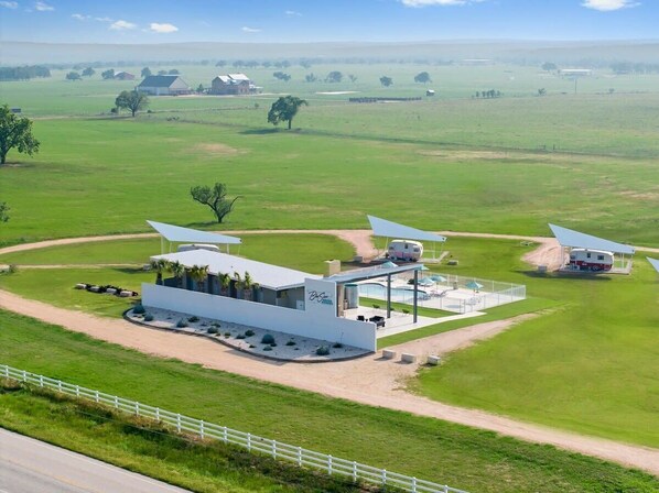 Escape to the Blue Skies Retro Resort, a Palm Springs-inspired oasis nestled outside Fredericksburg, Texas. Experience the ultimate glamping retreat at this unique resort property, boasting five reissued 1961 Shasta trailers, each offering a homely living space, a separate bathroom suite complete with a plush robe, and a spacious outdoor shower for a refreshing start to your day. Indulge in wine tasting adventures in the picturesque Texas Hill Country, then return to the resort to relax by the outdoor swimming pool or gather with friends in the covered pavilion featuring an outdoor wood-burning fireplace. With amenities such as WiFi, shared propane grills, outdoor lounge seating, private yards, and Bluetooth radios with curated records per camper, Blue Skies Retro Resort ensures an unforgettable getaway tailored to your group's needs. Make memories that last a lifetime at this vintage-inspired haven, where every detail promises relaxation and rejuvenation in a charming retro setting.
