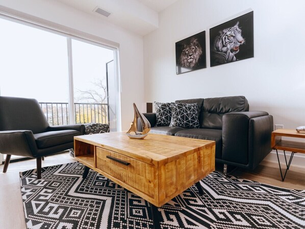 Relax in the spacious, stylish living area, offering stunning views of Osborne Village. Unwind on the comfortable sofa while enjoying your favorite shows on the Smart TV, or simply enjoy the peaceful ambiance of this cozy retreat.