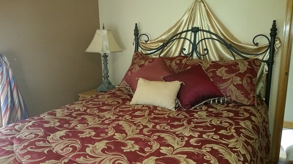 You'll find 4 bedrooms in the upstairs level: The master bedroom is an elegant room with a king-sized 4 poster bed, a cozy chair for reading, a huge closet, and a large chifferobe. The next room is a spacious queen room with a sleigh bed, vanity, large closet, and another beautiful chifferobe. Next is the twin room. It's perfect for kids or for those who prefer their own bed. Facing the back yard, this quiet room has 2 comfortable maple twin beds, and a large closet. The last bedroom is another queen room. It's cozy, quiet, and oh, so comfortable. Facing the east, it overlooks the large back yard, and greets you with a sunny "good morning." There is also a bathroom with tub and shower, vanity, and double sink.
