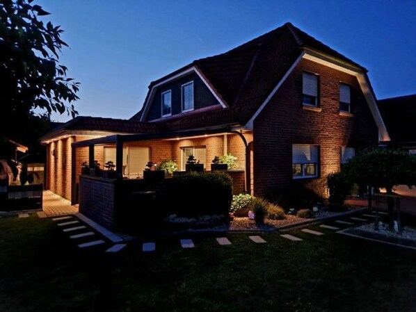 Apartment Wattstürmer: Kitchen: fully equipped kitchen with E.Cooker + oven, refrigerator, toaster, egg cooker, coffee machine, iron, ironing board, table + 6 chairs, highchair. Living room: comfortable 2er and 3er couch, Sat-TV, wall cupboard. Bedroom 1: double bed, bedside tables, wardrobe; Bedroom 2. Double bed, bedside cabinets, wardrobe, children's cot or travel cot can be set up if necessary. The bathroom with shower, vanity, toilet and potty is located next to the master bedroom. Non smoking. Downstairs in the garden a private terrace.