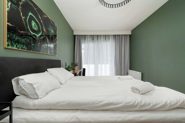 The prestigious 46 m² apartment comfortably accommodates 4 people, making it an ideal place for a family or a group of friends. It consists of a spacious living room with a kitchenette, a separate bedroom, and a bathroom with a shower. The living room features a comfortable, fold-out sofa that serves as a perfect spot for relaxation and rest during the day, and transforms into a cozy bed for two at night. The spaciousness of the interior is emphasized by large windows through which natural light flows, creating a pleasant, bright atmosphere. The living room also has air conditioning, providing a refreshing coolness on hot days. From the room, there is access to a balcony, which is a great place to relax outdoors. The kitchenette, equipped with modern appliances including an oven, microwave, induction cooktop, and a Nespresso coffee machine, makes cooking a true pleasure. Adjacent to it is a dining table, perfect for enjoying meals together in a warm and pleasant atmosphere. The bedroom offers a comfortable double bed, ensuring a peaceful sleep, as well as a desk and chair, providing an excellent space for work or personal activities. A spacious wardrobe accommodates all necessary belongings, and its subtle design blends perfectly with the rest of the interior. The bathroom, equipped with a washing machine and a modern shower, offers full comfort for longer stays. The apartment also offers a Smart TV with cable television and free Wi-Fi, providing easy internet access. An underground parking space is also available, adding to the comfort of the stay. The unique character of the interior is highlighted by wooden accents and beautiful green walls, which, combined with elegant accessories, create a harmonious and cozy atmosphere. This is a perfect place for those who value modern comfort, elegant décor, and proximity to city life.