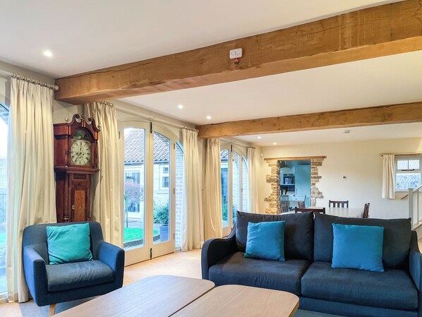 Nestled in Helmsley, The Cart House offers a serene escape amidst the North York Moors National Park. Inside, cozy up by the woodburner or enjoy meals together in the spacious living area with glass doors overlooking the garden. A modern kitchen awaits your culinary creations, while a rustic games room beckons for friendly competition.
