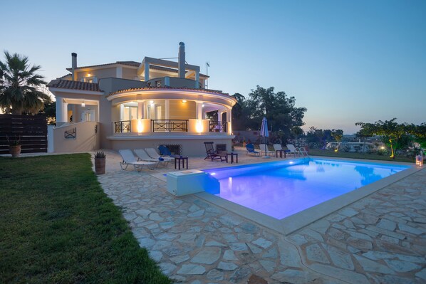 The house is a grand villa standing on the top of a hill with endless views to the bay of Laganas and most of the southern coastline of Zakynthos. This is an amazing 4 bedroom villa, ideal for big families in the vicinity of the sandy beaches of the south. The villa comes with private grounds, green areas, a private swimming pool and amazing views from its verandas and pool area. It is close to restaurants, bars, and the beaches but at the same time tucked away from the noise of the crowds.