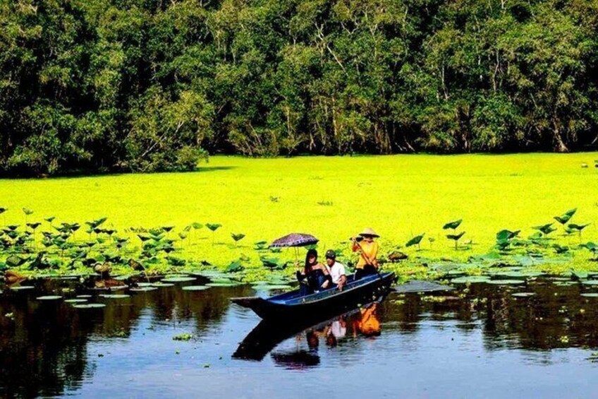 After lunch, travel to **Tra Su Cajuput Forest** near Chau Doc for a completely different side of the Mekong—quiet, green, and wonderfully peaceful. This protected wetland is known for its lush waterways and rich biodiversity, home to a variety of plants, birds, and other wildlife.