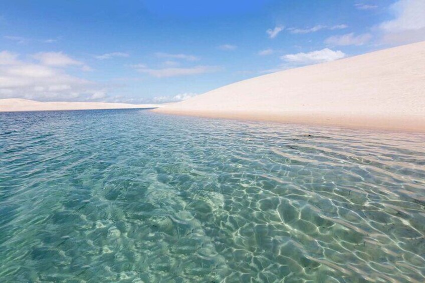 Atins is a charming village located on the eastern edge of the Lençóis Maranhenses, where the river meets the sea in a paradise-like setting. Reached by a 4x4 vehicle, the journey to Atins takes you through sandy trails, rivers, and breathtaking natural landscapes. The destination is known for its crystal-clear lagoons, towering dunes, and peaceful atmosphere — perfect for those seeking a deep connection with nature and authentic experiences. During the tour, you can visit the famous Capivara Lagoon, relax in hammocks on Atins Beach, and enjoy the delicious local cuisine, especially the grilled shrimp. Atins is also a popular spot for kitesurfing, thanks to the region's steady winds. This tour offers a perfect blend of sightseeing, relaxation, and adventure, making it an unforgettable experience in the Lençóis Maranhenses — ideal for all types of travellers.