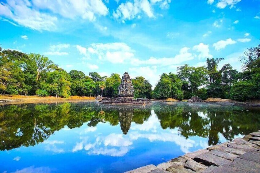 Neak Poan, also known as Neak Pean, which translates to "the entwined serpents," is an intriguing artificial island located within the Angkor Archaeological Site in Cambodia. This beautiful spot features a Hindu temple set upon a circular island in the Northern Baray, also called Jayatataka Baray, which is the last of the grand reservoirs constructed in Angkor. It is closely connected to the Preah Khan temple, built in the late 12th century in the Bayon style under the reign of King Jayavarman VII.