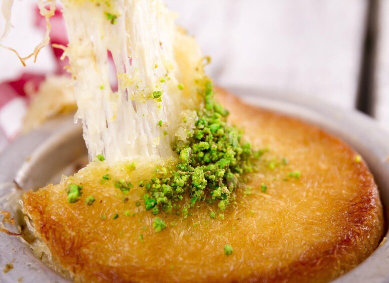 Once cooked, soak your kunefe with warm syrup and top it with pistachios. Finally, sit down together to enjoy your freshly prepared kunefe, served with tea and good conversation.
