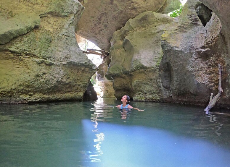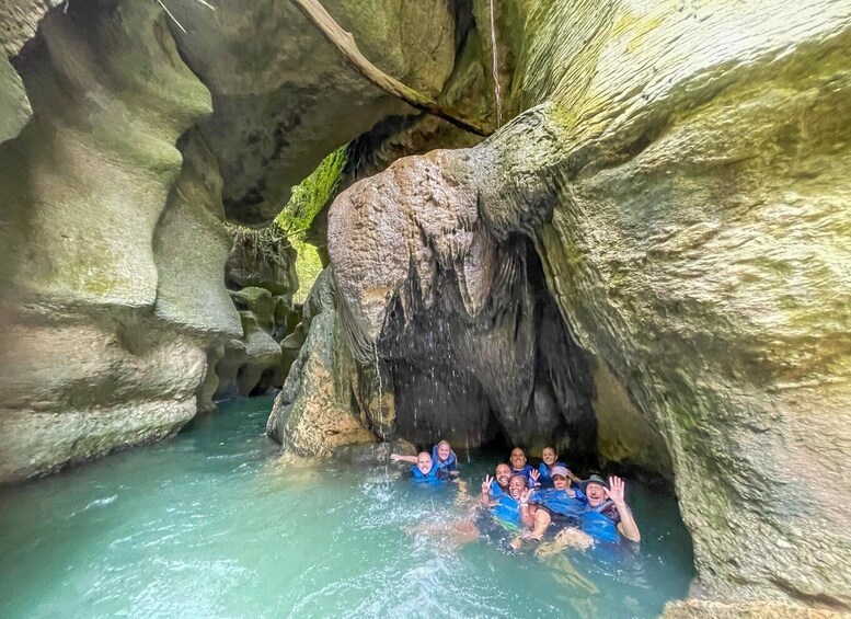 In this Full Day Adventure in pristine nature, you will hike, river trek and lazily float in beautiful emerald pools. Swim through breathtaking limestone canyons, underground dark caves and stunning rock formations sculpted by the passing of the river for thousands of years. Be amazed surrounded by lush scenery, a waterfall and the majestic mountains in secluded and less touristy spots. The more adventurous will have the chance for some optional cliff jumping too.