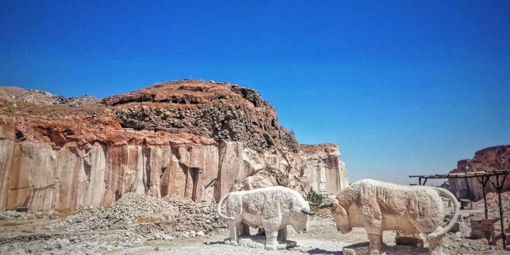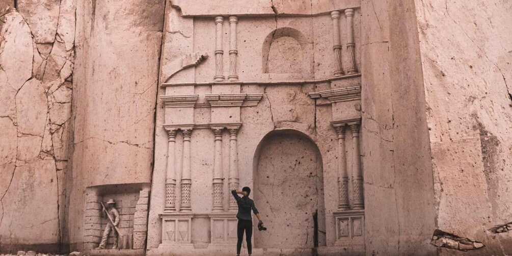 • The first point we will stop at will be the Añashuayco Quarry; which we will arrive in approximately 45 minutes. It is currently in operation, the stonemasons carry out their work very early; In the place we can see an immense canyon with cliffs (ignimbrite walls) that are several metres high, formed by the extraction for the formation of the Ashlars. At this point we will tell you the history of ashlar, its production and the use that has always been given to it. In this quarry you can see a Megacarving of the Church of the Company of Jesus made by the stonemasons themselves.