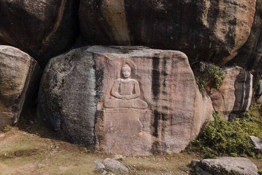 It is a high rock carving, the image of the seated Buddha. It is a reddish-brown coloured cliff that rises on the hillside to the southwest of Janabad (Shakhorai) village. It is at a distance of 5 kilometres from Manglawar. This huge illustration of the Buddha can be seen from the road, on the way to Malam Jabba. Due to its high position above the narrow terrace, it is well preserved except the nose seems to have been damaged by the vandals. The Buddha figure is about 7 metres high and is certainly the most impressive sculpture in the Gandhara region. This excellent figure of the Buddha is seated on a high throne in the attitude of meditation. The snail shell curls of this Buddha are very carefully rendered. His eyes are more than half closed, there is a prominent Ushnisha and long ear lobes. The folds of the robe are stringy, with a planned alteration of high and low ridges. Though the figure exhibits the Gandhara style in the drapery with pleats and the hair.