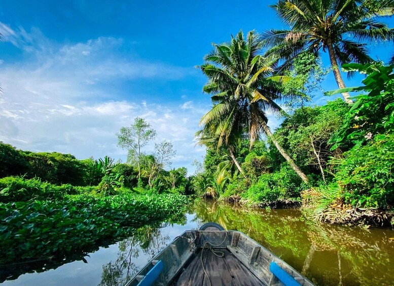 Activity 6: Your sampan will slow down the long-tail engine, and cruising slowly so that you can enjoy as much as possible the Can Tho nature’s song and magical napa palm, water coconut, freshwater mangrove, coconut canals…