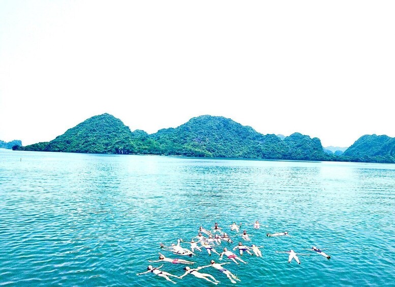 – Moving to private swimming zone in the middle of Ha Long Bay named Cam lagoon where there is tranquil area and you can swim in half an hour with blue, clear water, jump from the deck of the boat(very perfect)