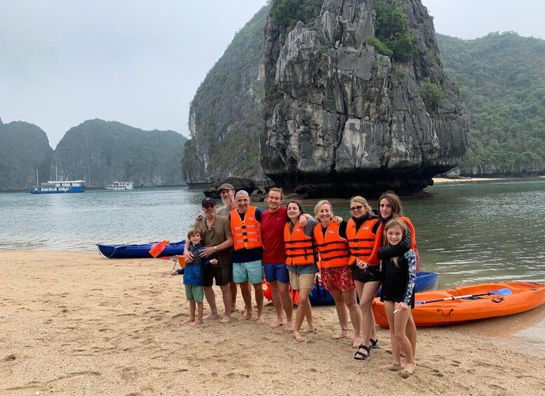 – Keep cruising to the border between Ha Long bay and Lan Ha Bay where you enjoy kayaking (one and half an hour) through some caves named BRIGHT CAVE -DARK CAVE-BAT CAVE to explore the beauty of the nature in hidden lagoons.(wonderful experience)