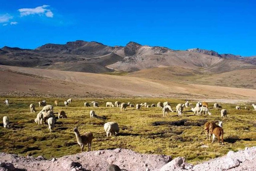 Continue to Patahuasi in the Pampa Cañahuas, part of the Aguada Blanca National Reserve. Surrounded by the dramatic backdrop of the Chachani volcano, this area is home to vicuñas, llamas, and alpacas. Warm up with herbal teas made from coca, chachacoma, or muña, and browse for local crafts and souvenirs. Facilities are available for your comfort.