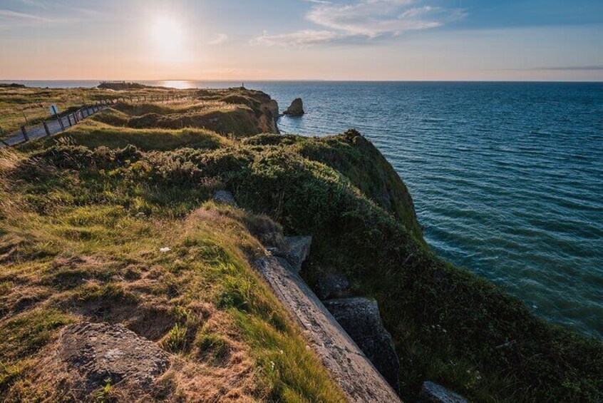 Explore bomb craters, casemates, and cliff-top positions stormed by the 2nd Rangers under Lt. Col. Rudder. Sweeping Channel views frame this dramatic battlefield.