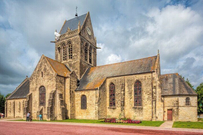 Pause in the famous Airborne town to see the church’s stained-glass paratroopers and the effigy recalling the “Longest Day” storey. Time for lunch at a café or bakery (own expense) and a quick browse of the Airborne Museum gift shop if desired.
