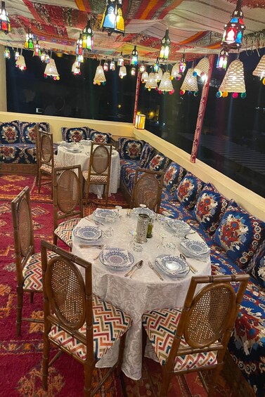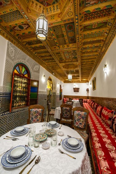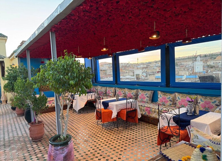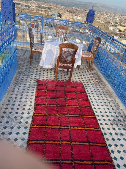 Experience this unforgettable moment on the rooftop of one of the beautiful palaces in the old city of Fez. As the sun rises, admire the panoramic view of the ancient medina, with its traditional houses, narrow streets, and historic minarets stretching across the horizon. Feel the warmth of the morning sun and the peaceful atmosphere above the bustling city. Embrace this authentic culinary journey and savour the perfect harmony of taste, culture, and breathtaking views.